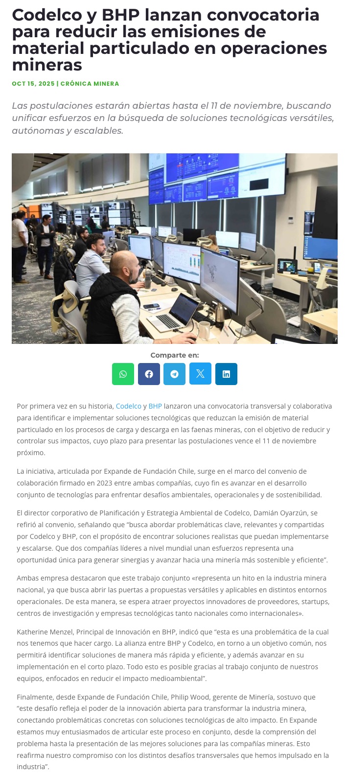 Codelco y BHP lanzan desafío de innovación colaborativo para reducir las emisiones de material particulado en operaciones mineras - (elamerica)