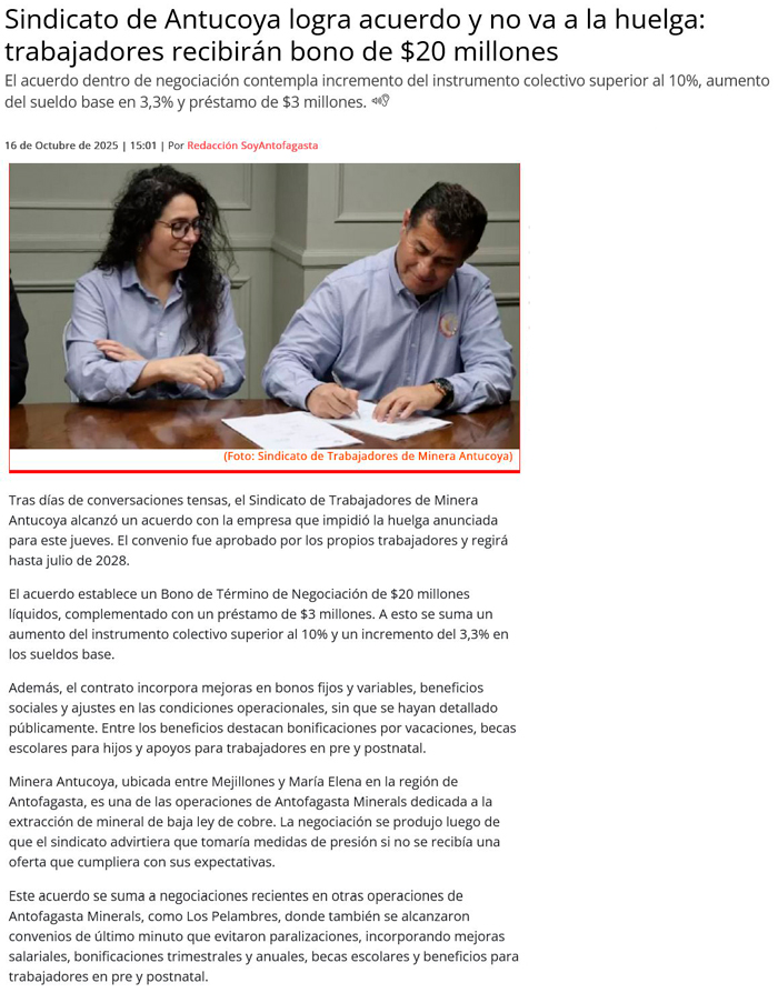 Sindicato de Antucoya cierra negociación con bonos por $23 millones - (El Mercurio de Antofagasta)