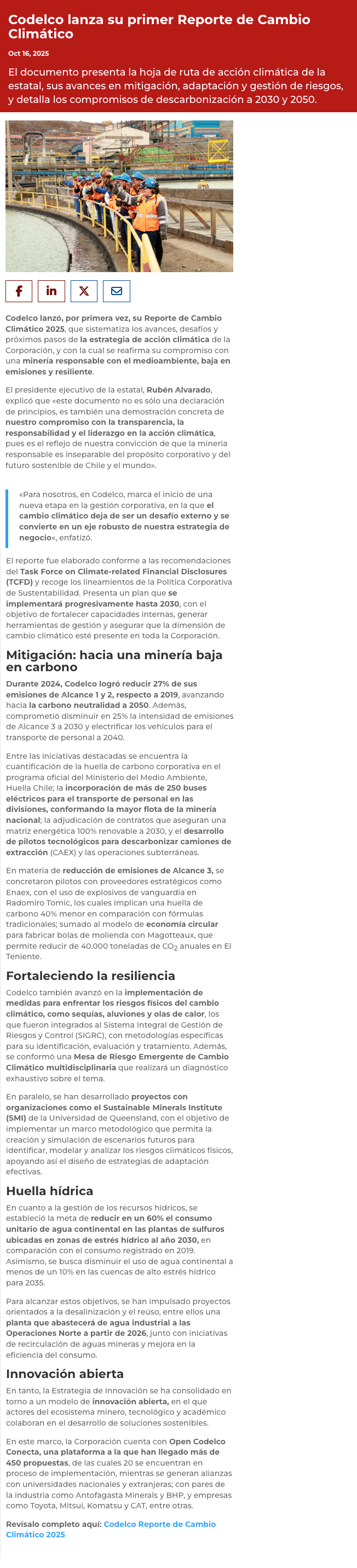 Codelco lanza su primer Reporte de Cambio Climático y consolida su estrategia hacia una minería más resiliente y baja en emisiones - (elamerica)