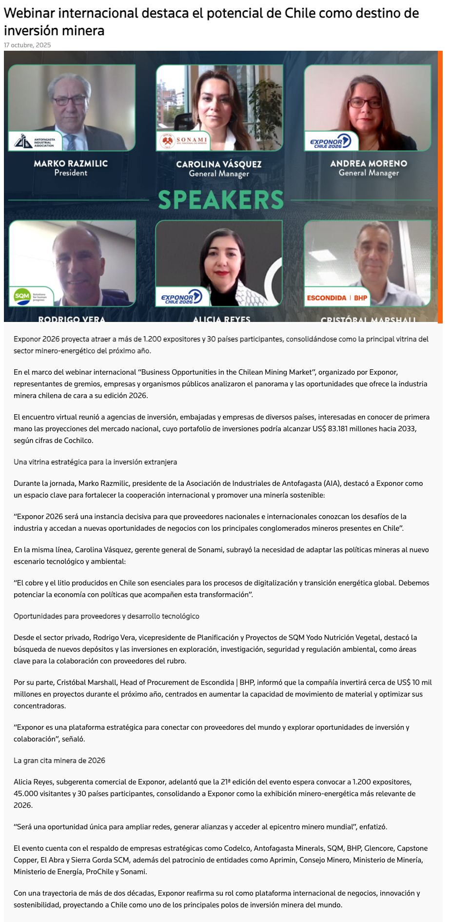 Webinar internacional EXPONOR destaca el potencial de la minería chilena - (antofagastanoticias)