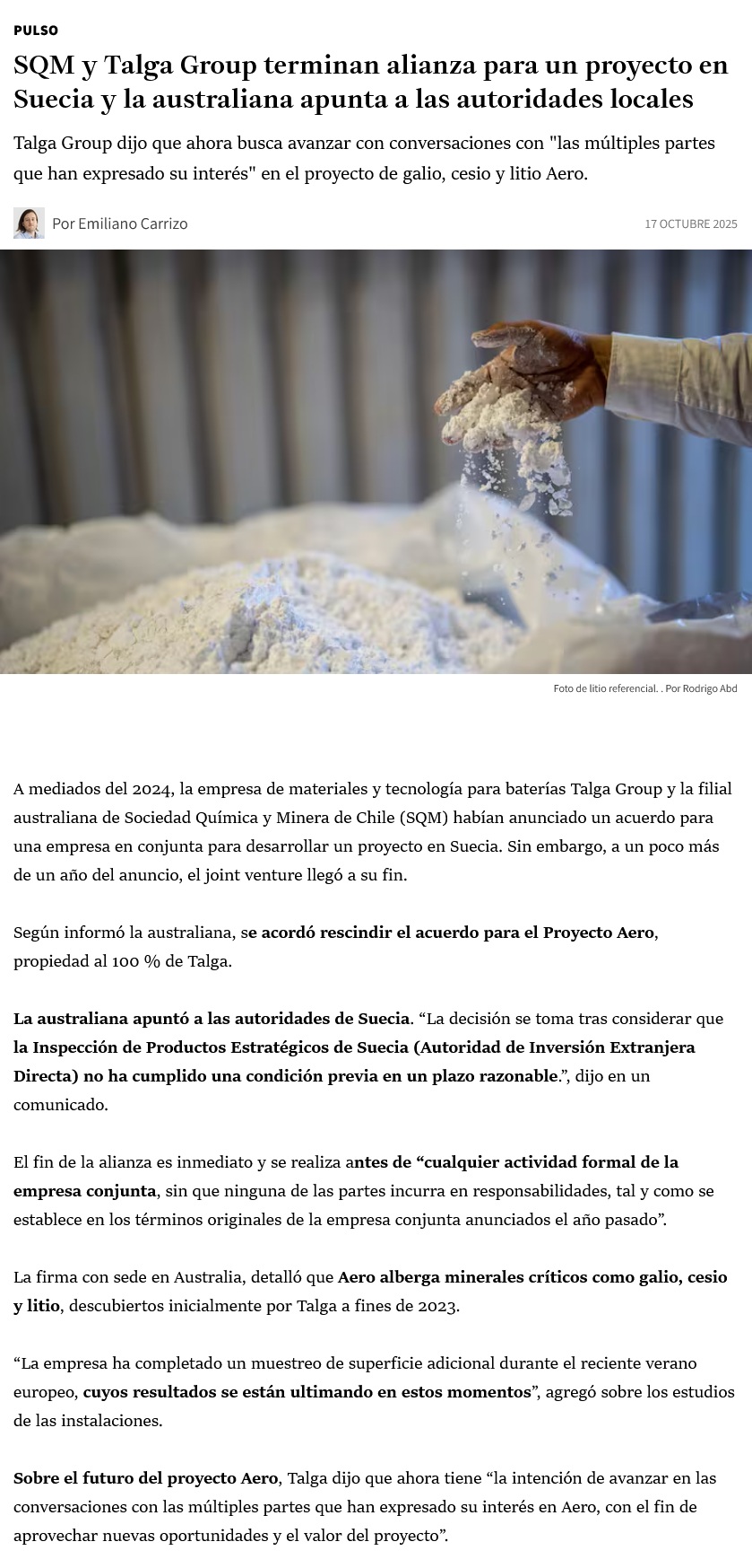 La chilena SQM y Talga Group acuerdan finalizar la 'joint venture' para un proyecto de litio en Suecia - (Estrategia)