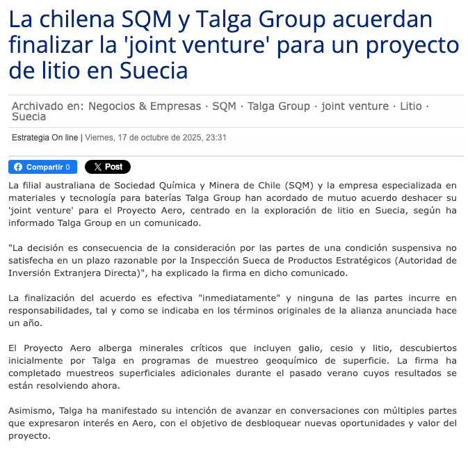 SQM y Talga Group terminan alianza para un proyecto en Suecia y la australiana apunta a las autoridades locales - (La Tercera Online)