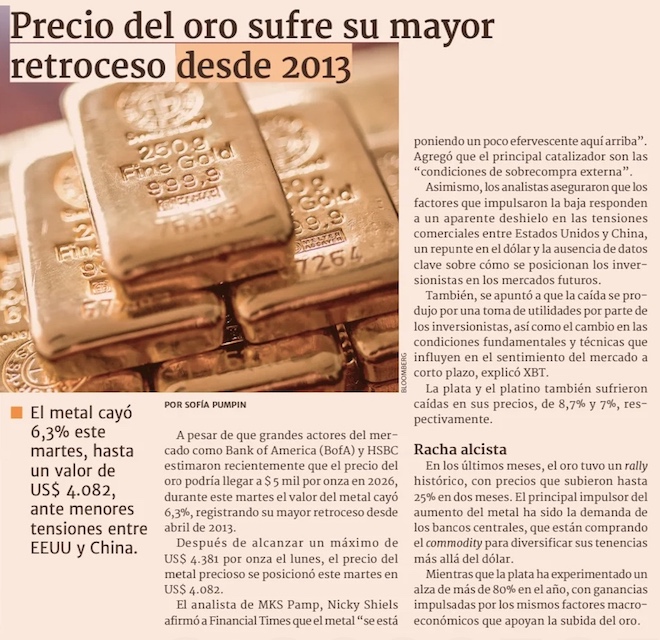 Precio del oro anota su retroceso porcentual más pronunciado en años - (El Mercurio de Santiago)