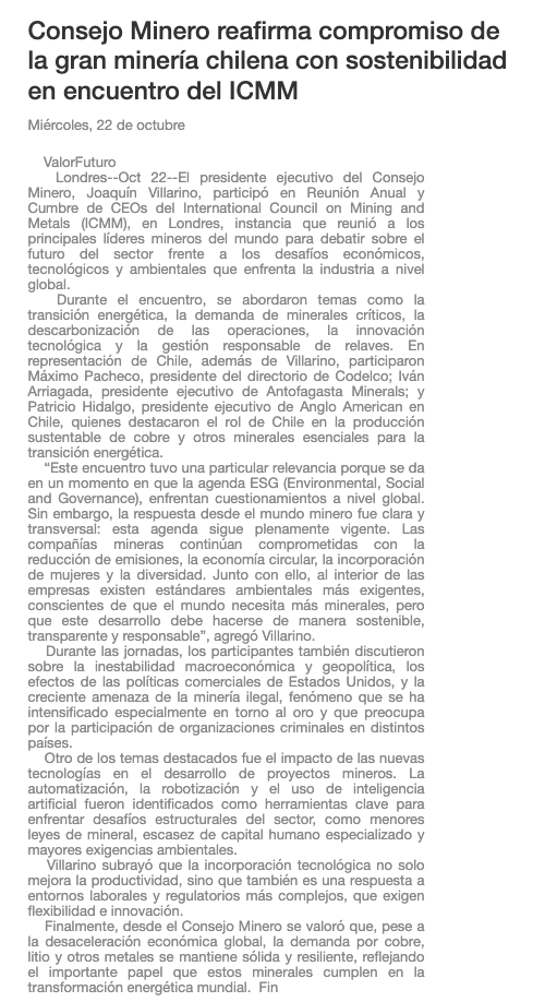 Consejo Minero reafirma compromiso con la sostenibilidad minera en Londres - (norteonline.cl)