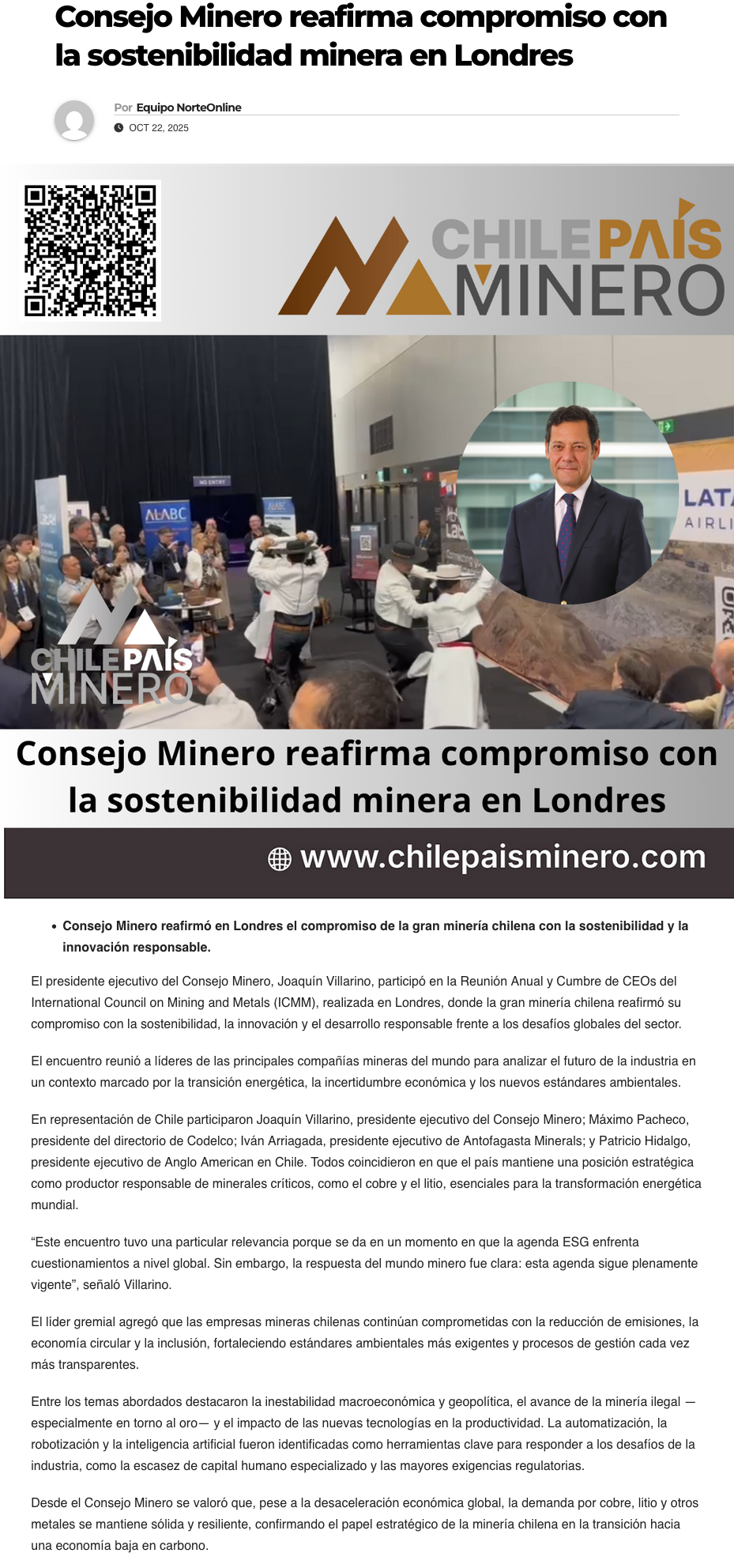 Consejo Minero reafirma compromiso con la sostenibilidad minera en Londres - (chilepaisminero.cl)