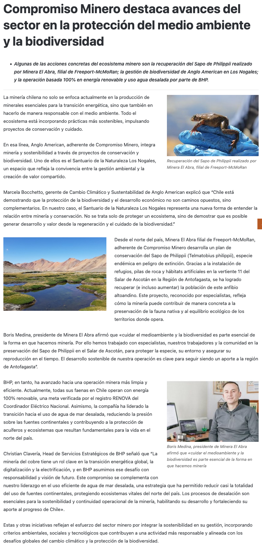 Compromiso Minero destaca avances del sector en la protección del medio ambiente y la biodiversidad - (diarioangamos)