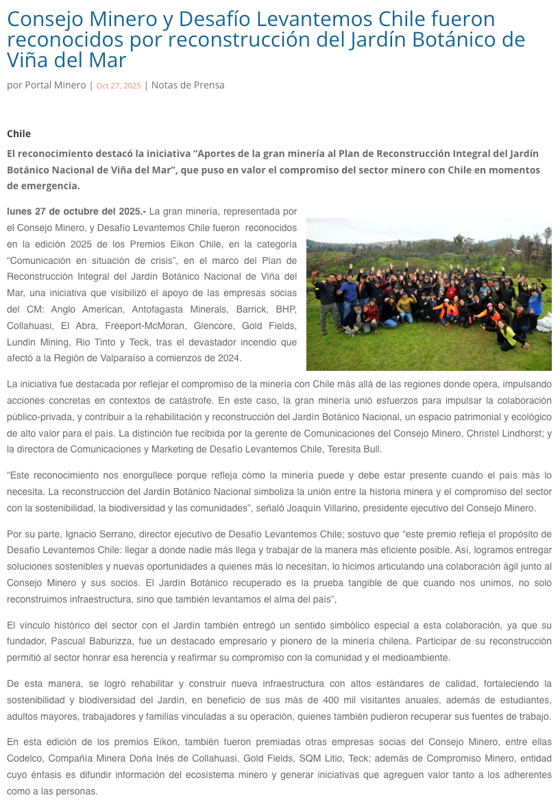 Consejo Minero y Desafío Levantemos Chile fueron reconocidos con premio Eikon por reconstrucción del Jardín Botánico de Viña del Mar - (redimin)