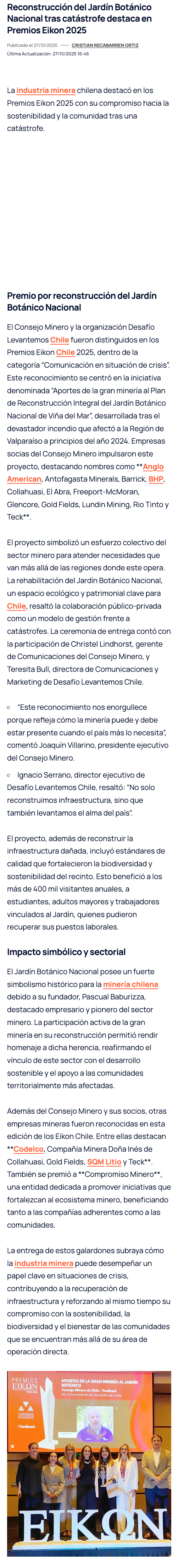 Consejo Minero y Desafío Levantemos Chile fueron reconocidos con premio Eikon por reconstrucción del Jardín Botánico de Viña del Mar - (redimin)
