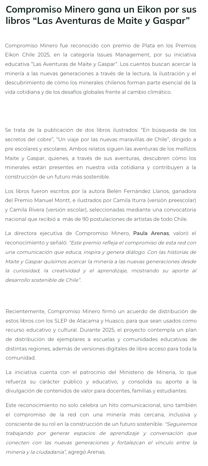 Compromiso Minero gana un Eikon por sus libros “Las Aventuras de Maite y Gaspar” - (guiaminera.cl)