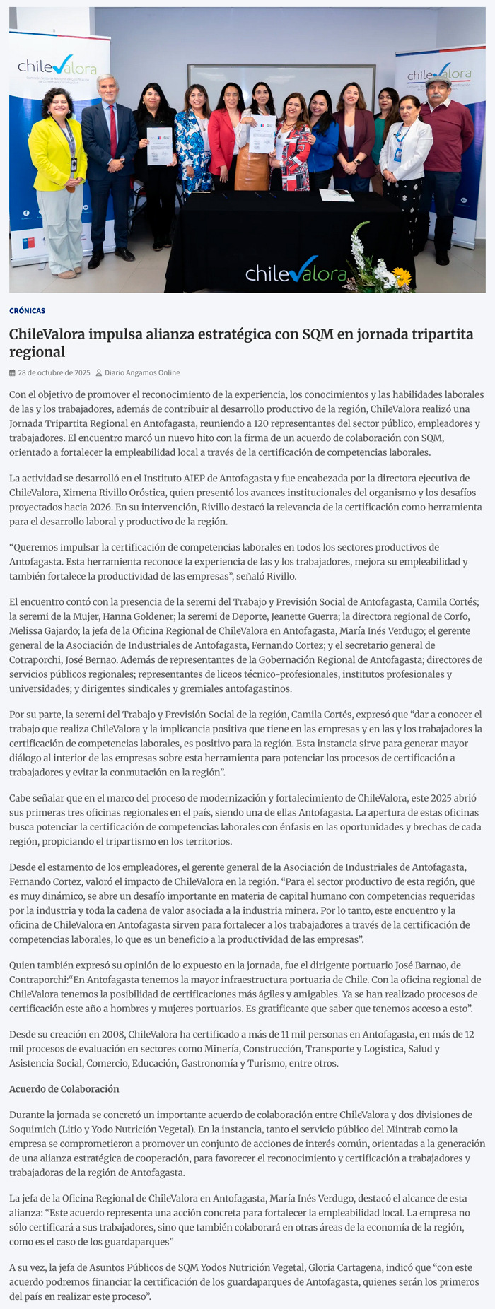 ChileValora logra formar con SQM una alianza estratégica para instar la empleabilidad local certificada - (El Mercurio de Calama)