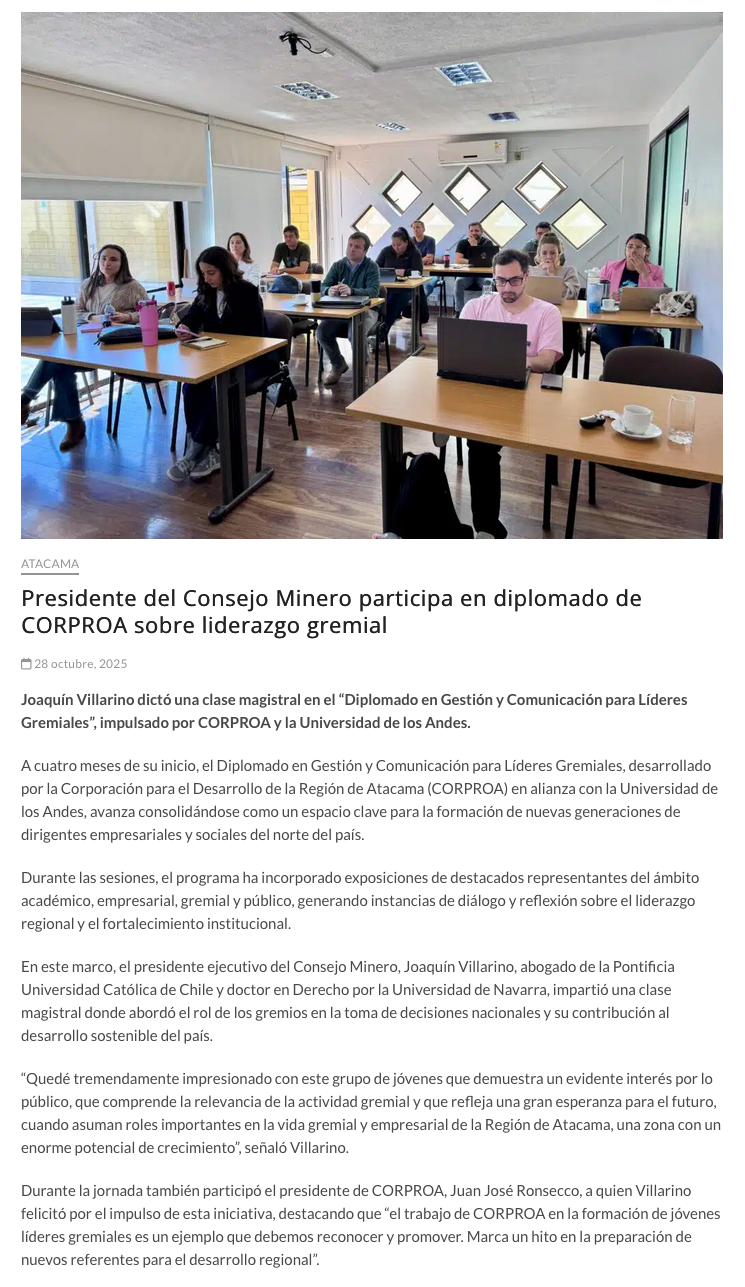 Presidente del Consejo Minero participa en diplomado de CORPROA sobre liderazgo gremial - (elzorronortino.cl)