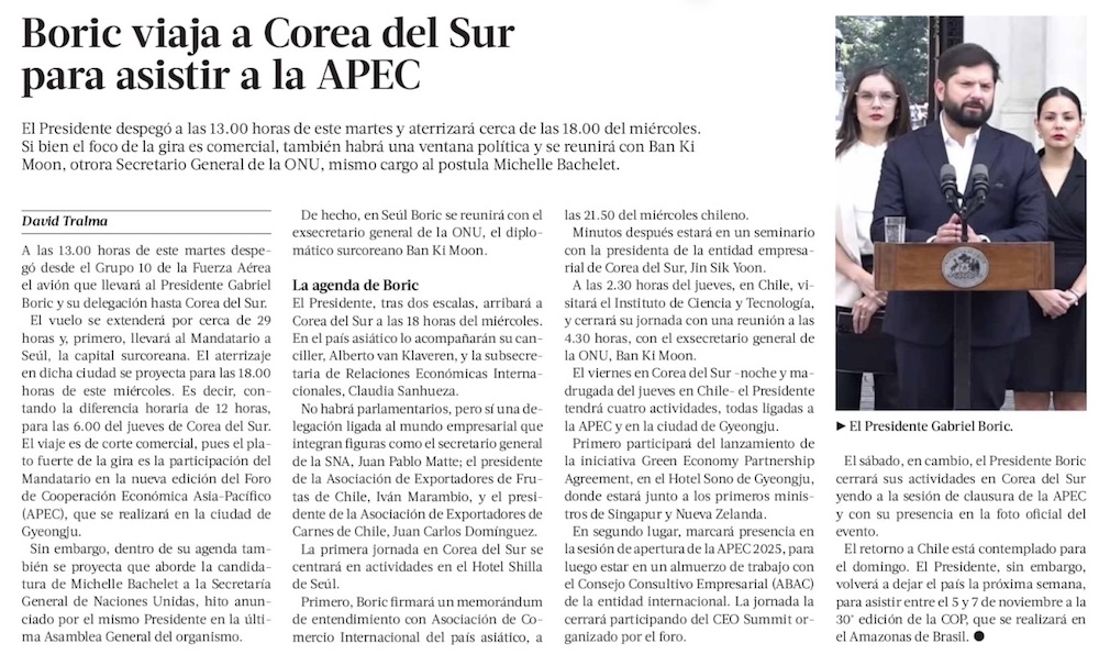 Presidente Boric inicia viaje a Corea del Sur: en su agenda destacan una cita sobre inversiones y la cumbre de APEC - (Diario Financiero)