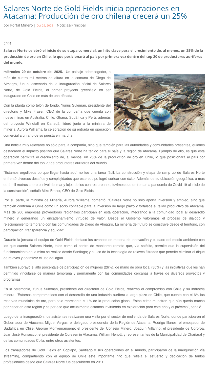 Gold Fields dio el vamos a Salares Norte, primer proyecto greenfield inagurado en Chile en los últimos diez años - (electromineria.cl)