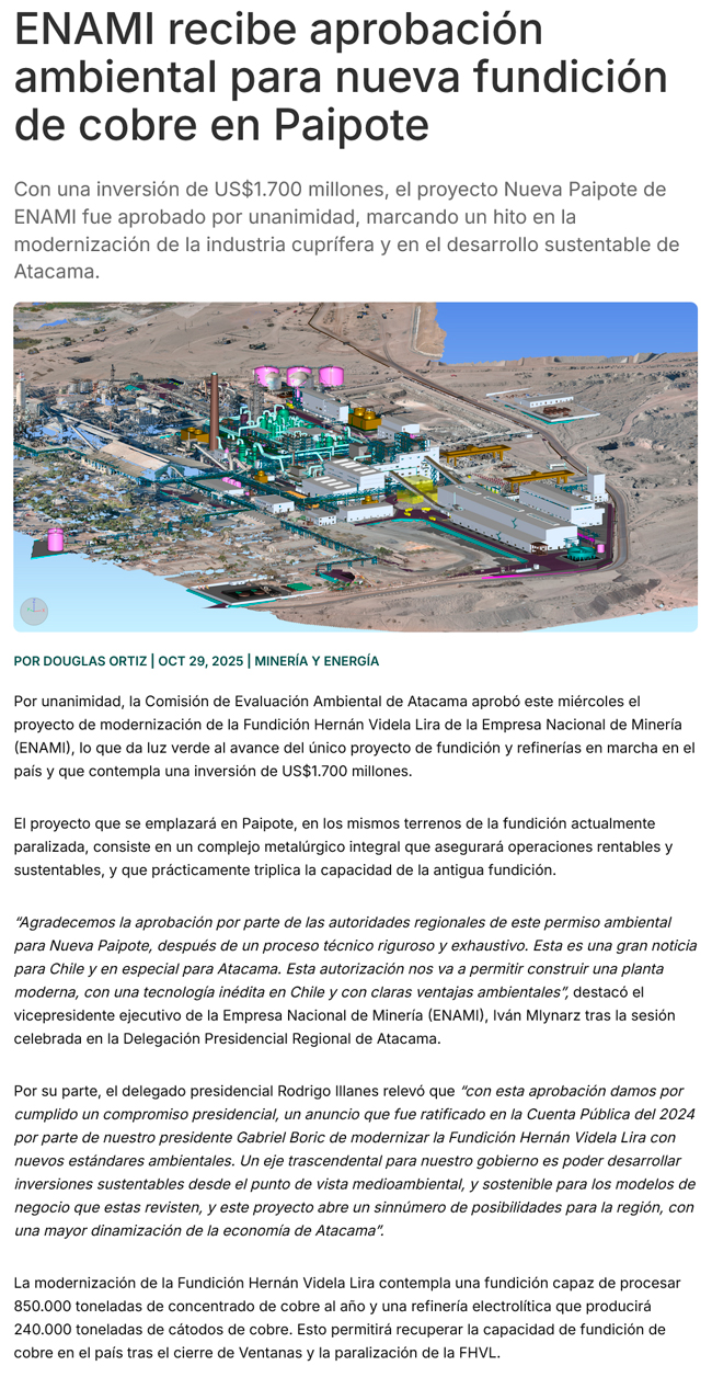 Enami recibe aprobación ambiental para impulsar modernización de la fundición de cobre en Paipote - (electromineria.cl)