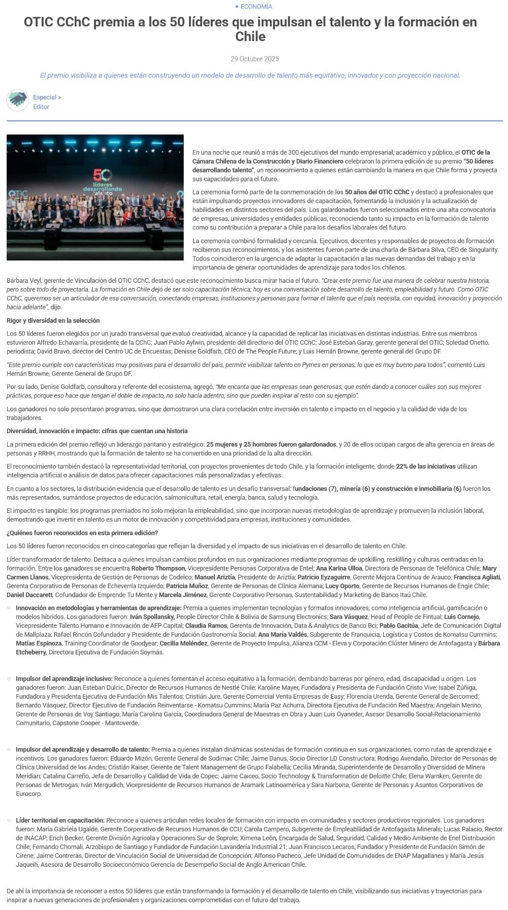 OTIC CChC premia a los 50 líderes que impulsan el talento y la formación en Chile - (Estrategia)