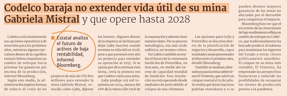 Codelco evalúa el futuro de sus activos de baja rentabilidad - (El Mercurio de Santiago)
