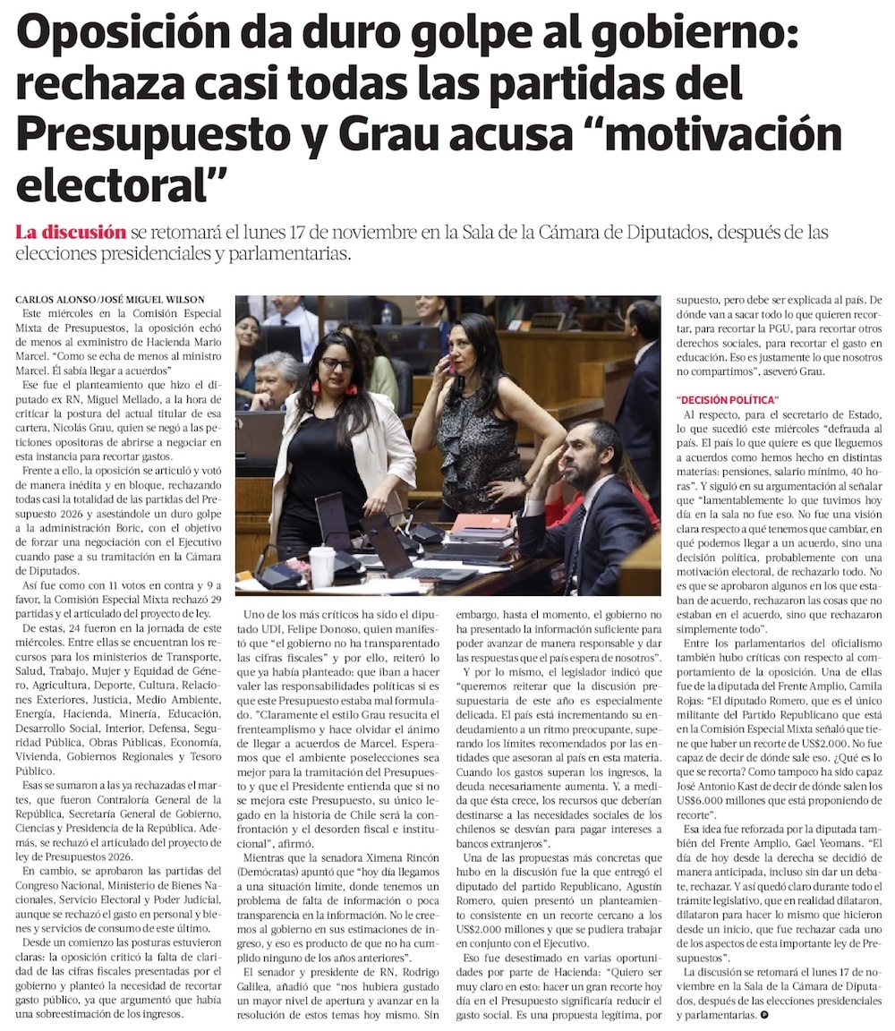 Duro revés para Grau: parlamentarios rechazan casi todos los gastos y tensionan el debate presupuestario - (El Mercurio de Santiago)