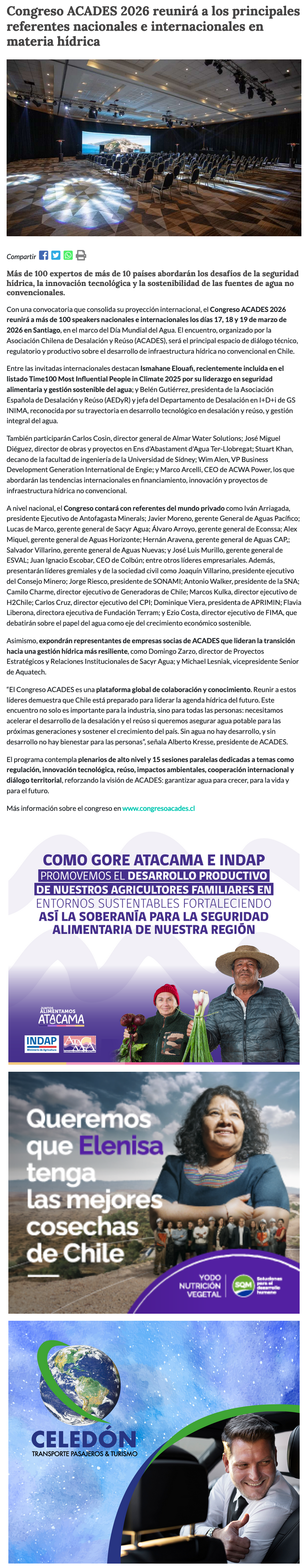 Congreso ACADES 2026 reunirá a los principales referentes nacionales e internacionales en materia hídrica - (nuevaminería online)