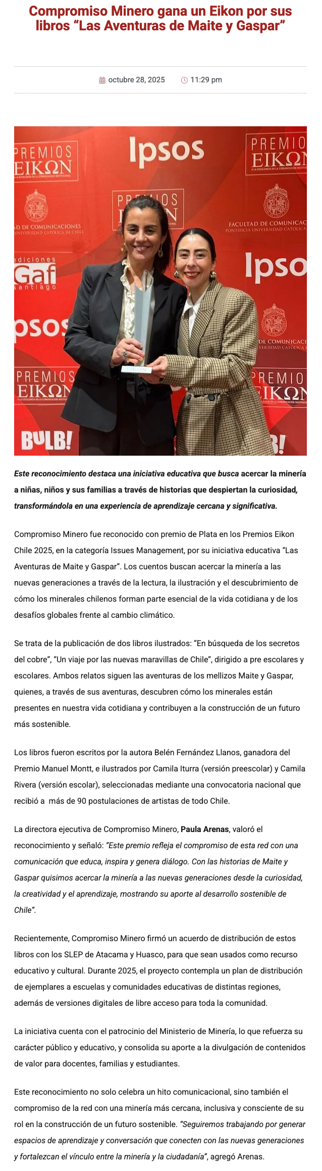 Compromiso Minero gana un Eikon por sus libros “Las Aventuras de Maite y Gaspar” - (portalminero)