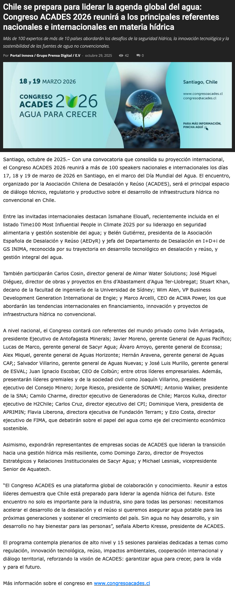 Congreso ACADES 2026 reunirá a los principales referentes nacionales e internacionales en materia hídrica - (nuevaminería online)