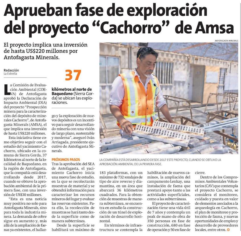 Nueva fase de exploración de Cachorro tarda un tercio del tiempo en aprobarse - (El Mercurio de Antofagasta)