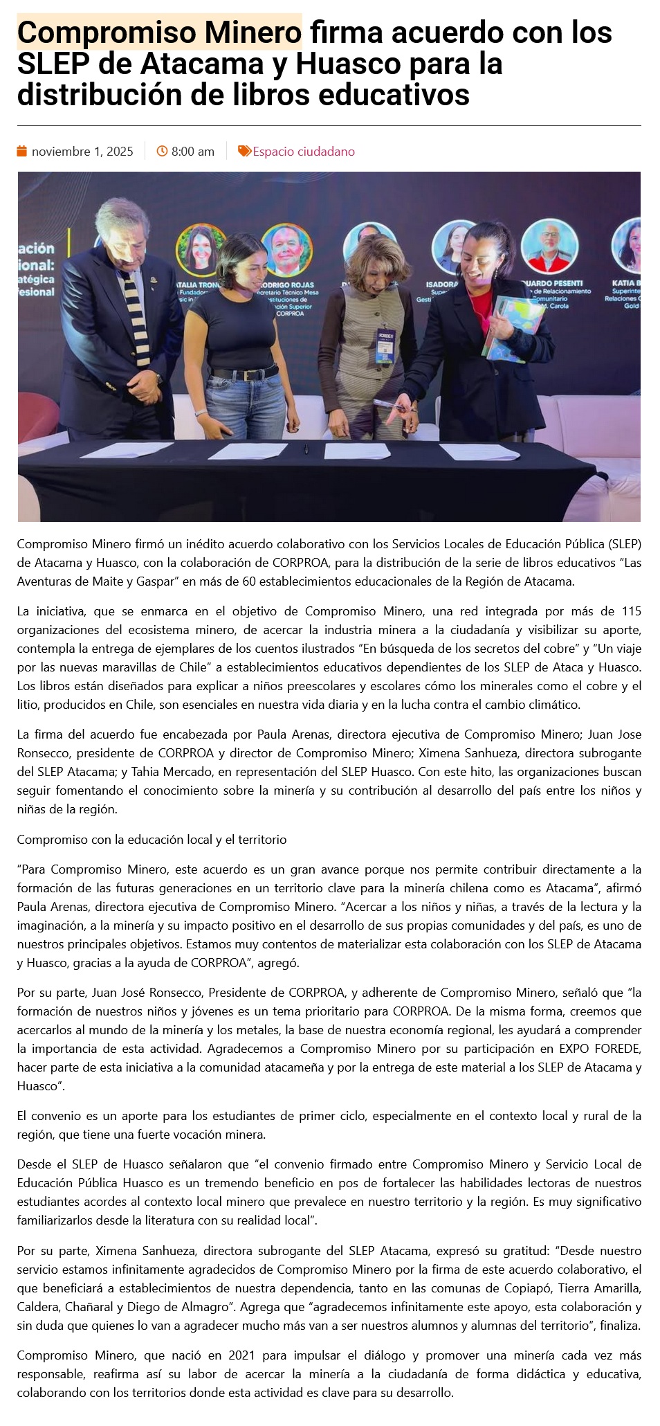 Compromiso Minero firma acuerdo con SLEP de Atacama y Huasco para entregar libros educativos sobre minería - (madero.cl)