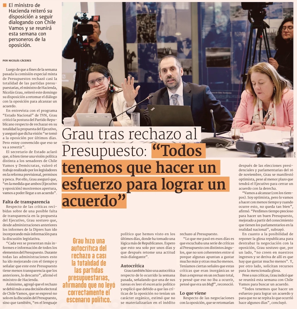 Grau apunta a la “derecha tradicional” por el revés presupuestario, y Chile Vamos le pide “autocrítica” - (El Mercurio de Santiago)