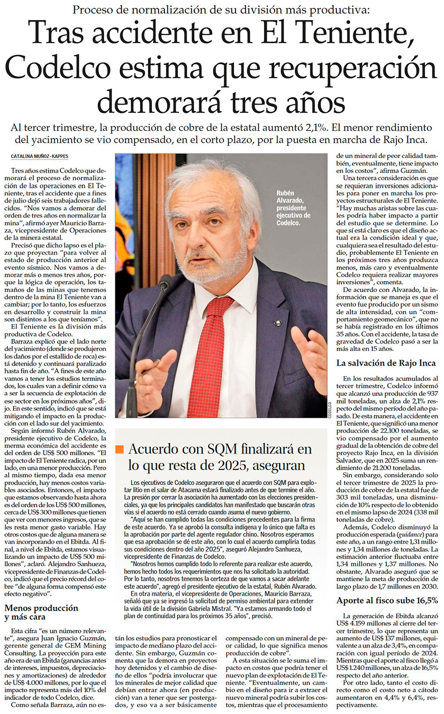DMH encabeza el aumento productivo de Codelco durante el tercer trimestre - (El Mercurio de Antofagasta)