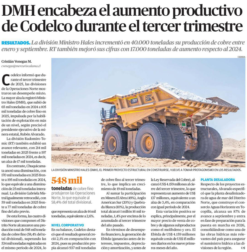 Producción de cobre de Codelco aumenta a septiembre por división Hales, pero su ganancia consolidada cae 30% - (Pulso)