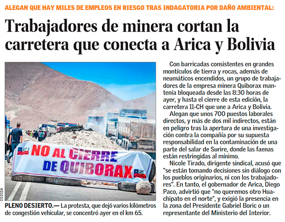 Trabajadores de Quiborax interrumpen tránsito en la 11 CH - (Estrella de Arica)