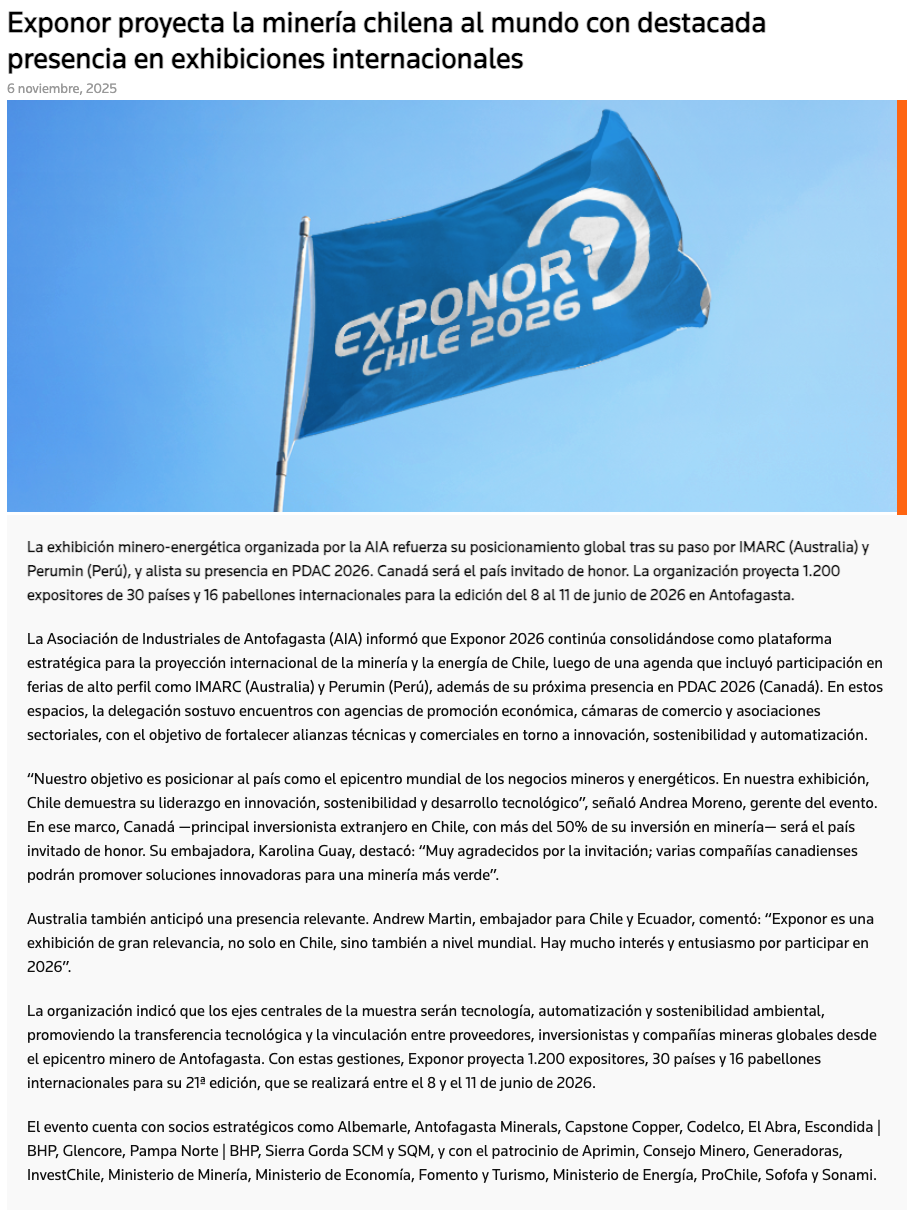EXPONOR proyecta la minería chilena al mundo con destacada presencia en exhibiciones internacionales - (mvcomunicaciones.cl)