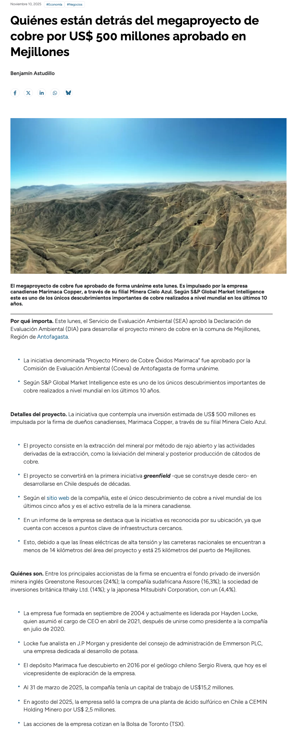 Marimaca Copper Corp obtiene aprobación ambiental para proyecto minero en Chile - (mch.cl)