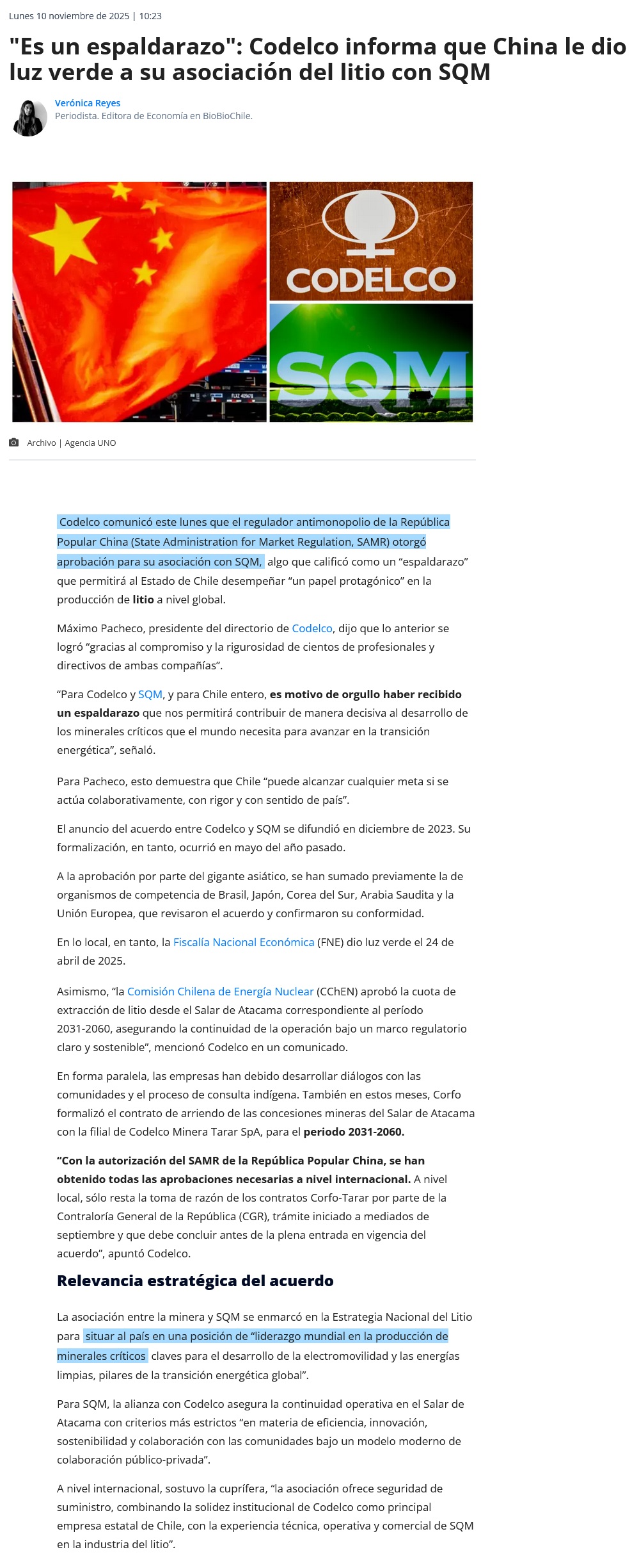 Codelco y SQM finalmente reciben la aprobación del regulador de China para su acuerdo de asociación por el litio - (La Tercera Online)