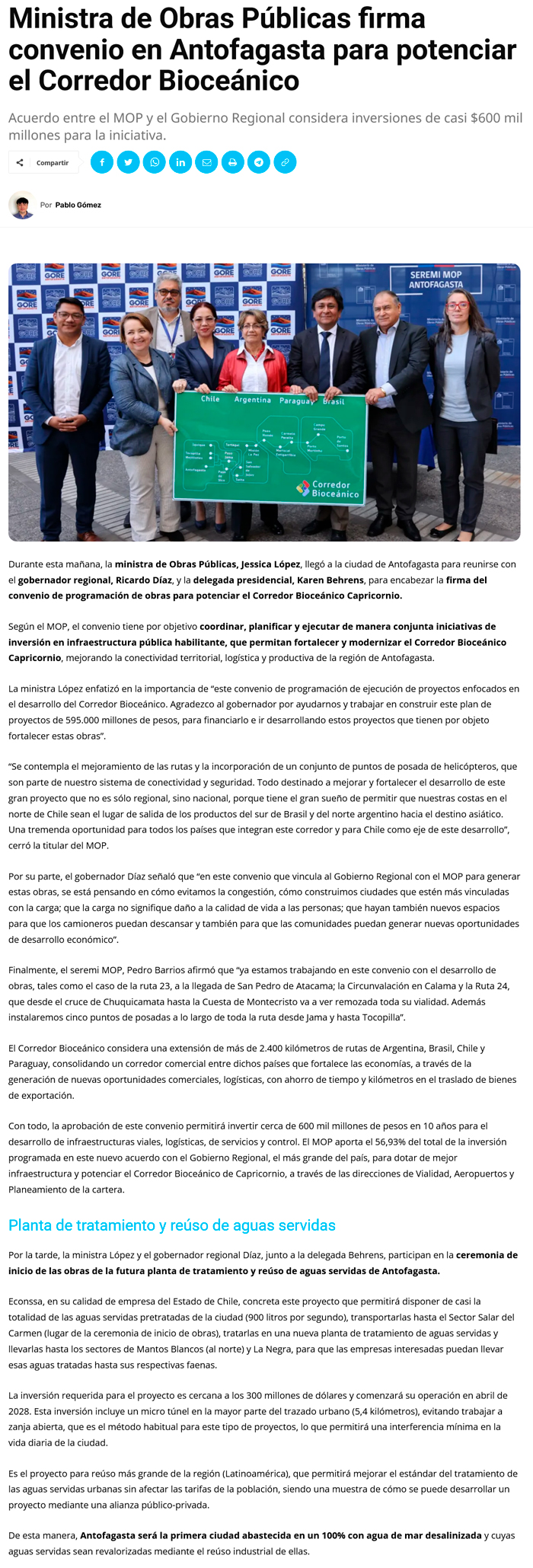 MOP y GORE firman histórico convenio para potenciar proyecto de Corredor Bioceánico - (El Mercurio de Antofagasta)