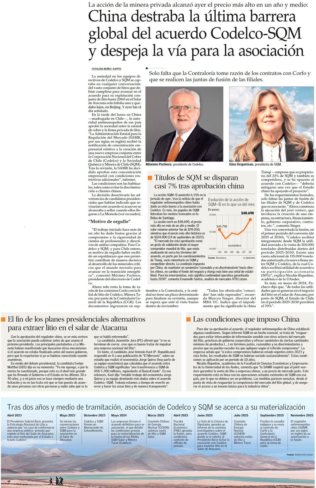 Codelco-SQM obtiene la luz verde de China: resta Contraloría, posible nueva arista en la FNE y desechar la “cláusula SEC” - (Diario Financiero)
