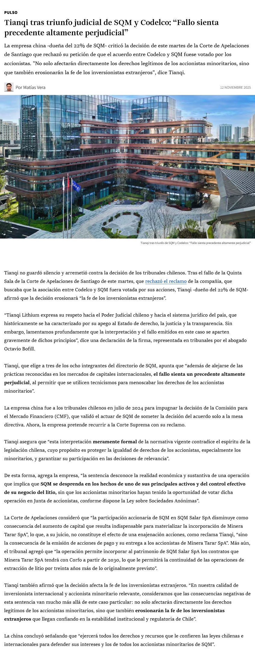 Tianqi tras triunfo judicial de SQM y Codelco: “Fallo sienta precedente altamente perjudicial” - (Pulso)