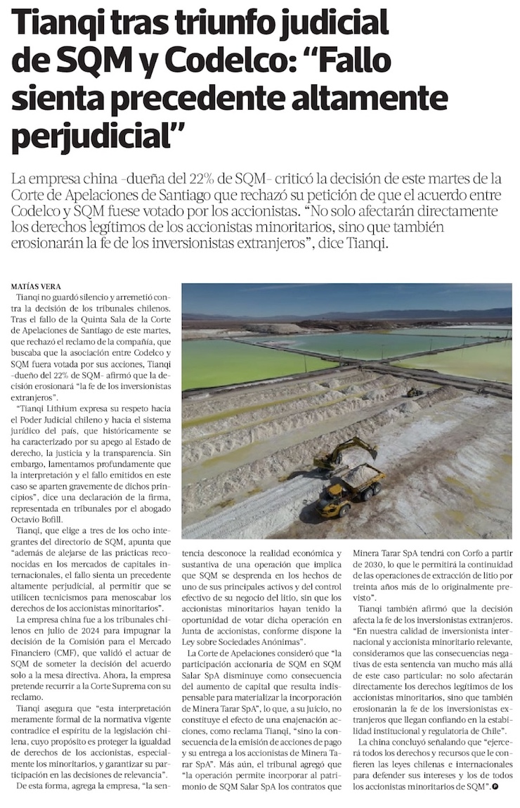 Tianqi dispara con todo contra decisión judicial que visa acuerdo Codelco-SQM: afecta a la minera, a los minoritarios y hasta a la inversión extranjera - (DF Online)