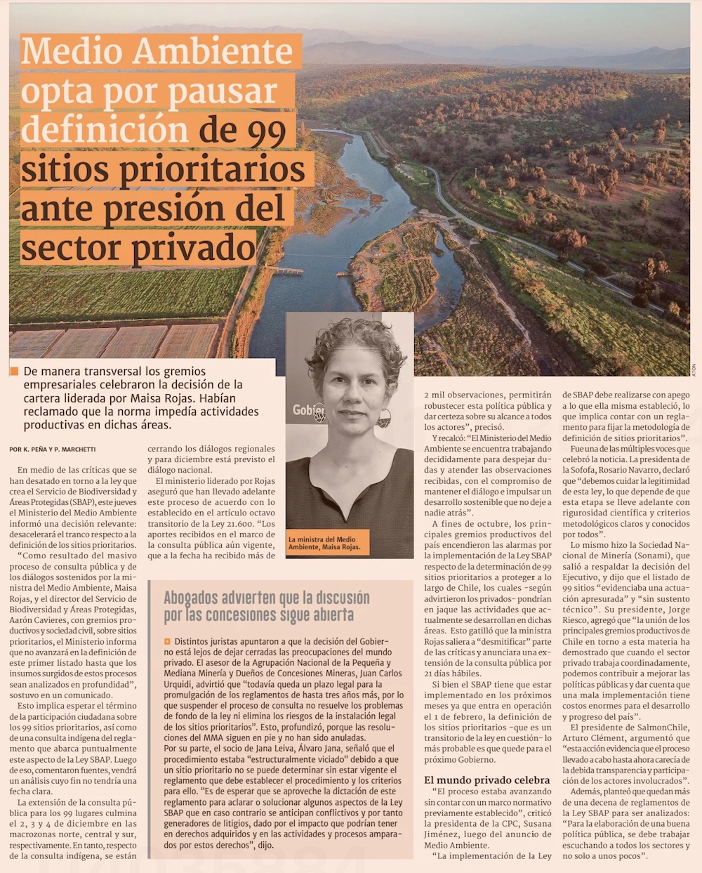 Ley SBAP: Gobierno desiste de avanzar en definición de sitios prioritarios - (El Mercurio de Santiago)