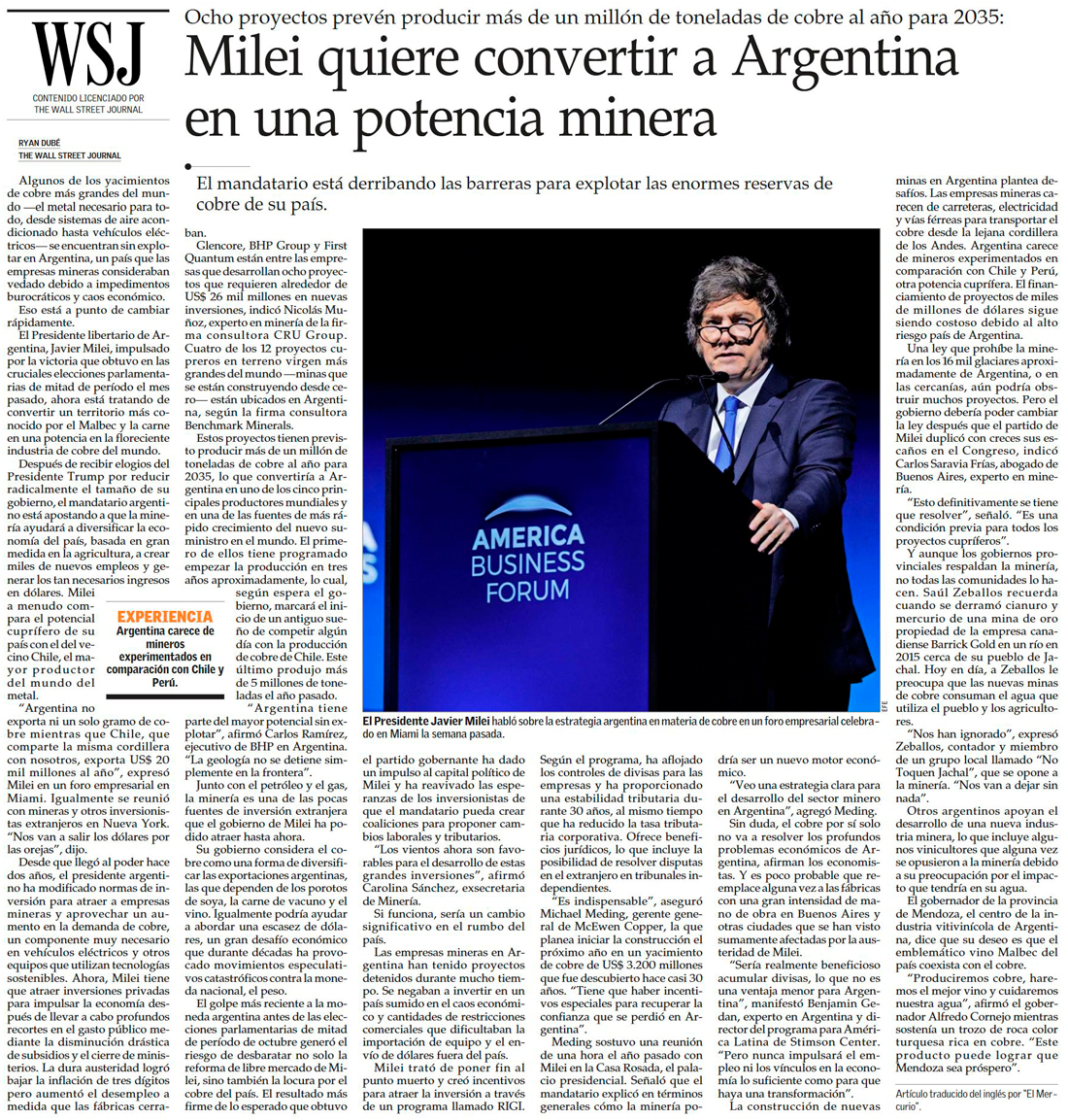 Milei planea modificar ley de glaciares para destrabar proyectos de cobre y litio - (El Mercurio Inversiones)