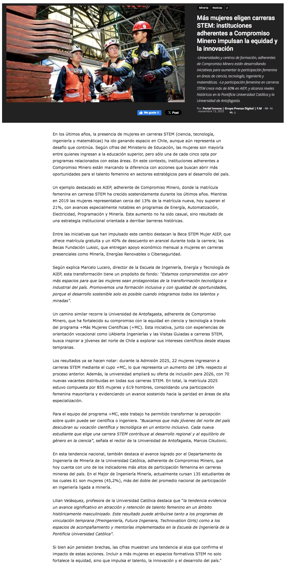Más mujeres eligen carreras STEM: instituciones adherentes a Compromiso Minero impulsan la equidad y la innovación - (prensaeventos.cl)