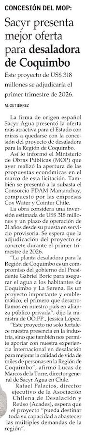 Consorcio español Sacyr gana licitación de desaladora de Coquimbo - (El Día)