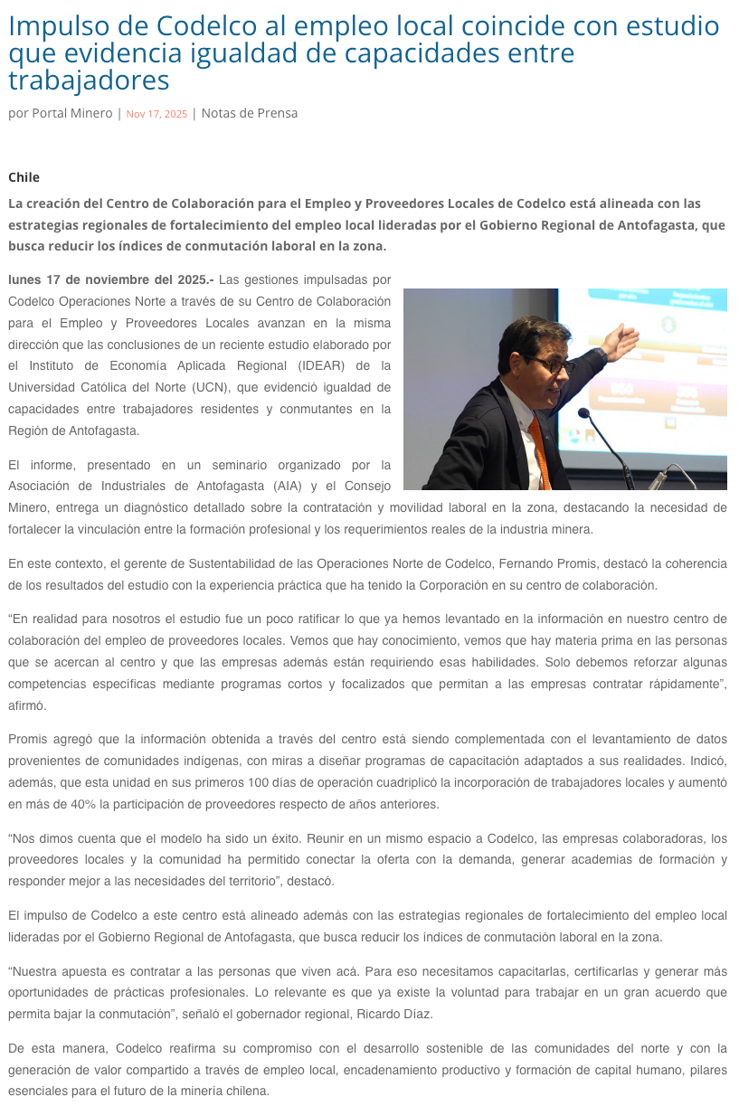 Impulso de Codelco al empleo local coincide con estudio sobre igualdad de capacidades entre trabajadores residentes y conmutantes - (mch.cl)