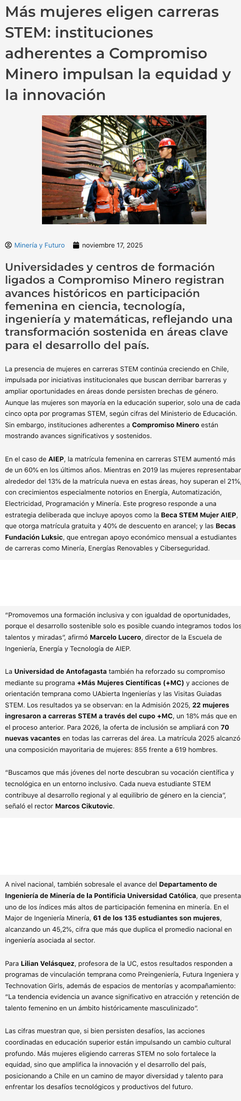 Más mujeres eligen carreras STEM: instituciones adherentes a Compromiso Minero impulsan la equidad y la innovación - (guiaminera.cl)