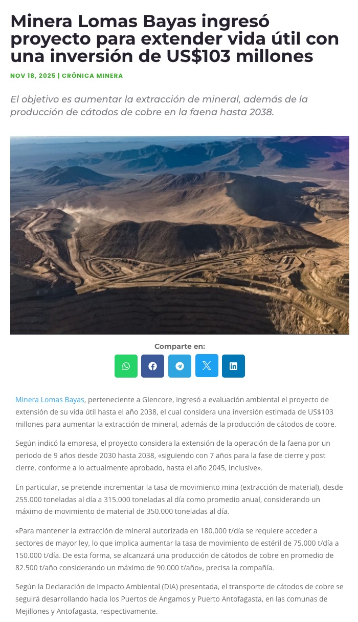 Lomas Bayas extenderá su operación hasta 2038 con una inversión de US$ 103 millones - (El Mercurio de Calama)