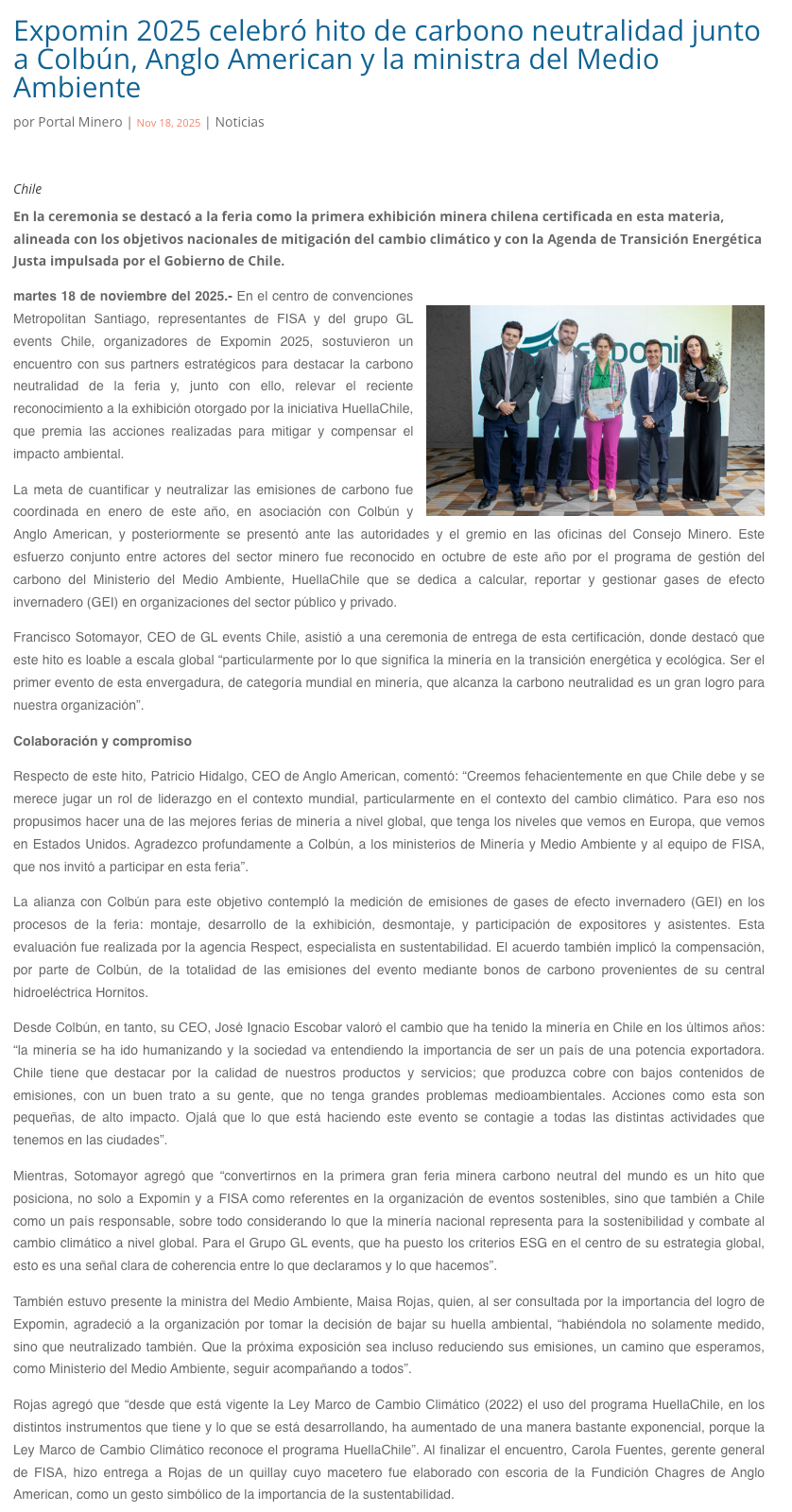 Expomin 2025 celebró hito de carbono neutralidad junto a Colbún, Anglo American y la ministra del Medio Ambiente - (nuevaminería online)