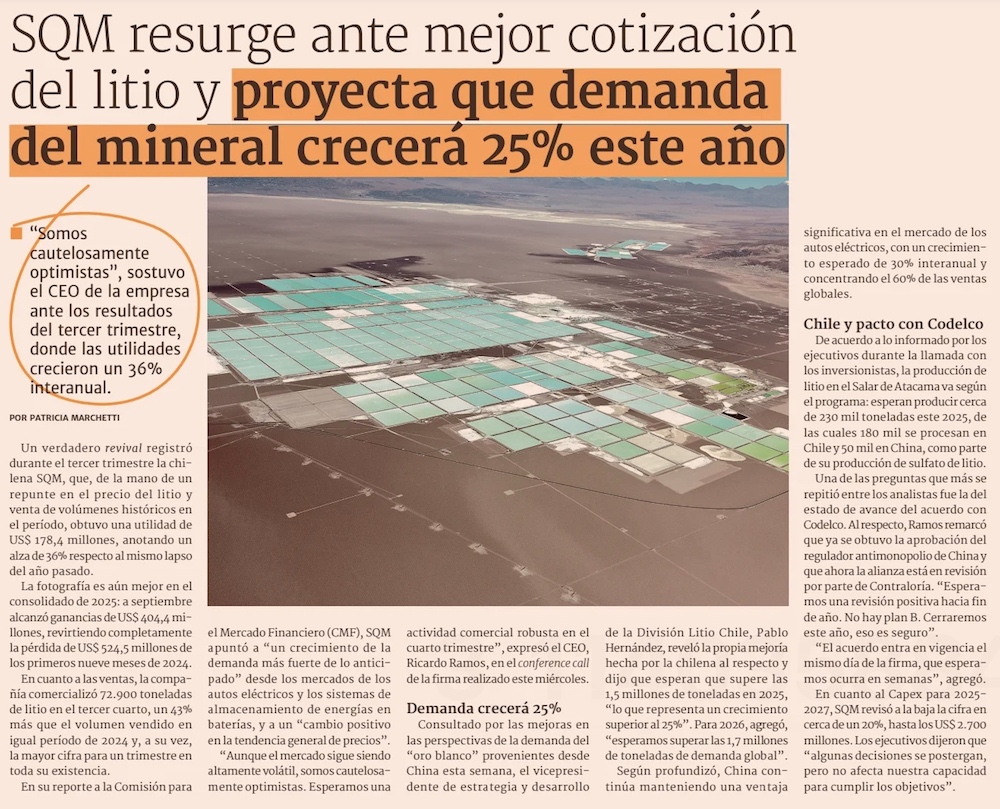 SQM marca récord de ventas de litio y prevé nueva alza de precios en el cuarto trimestre - (El Mercurio de Antofagasta)