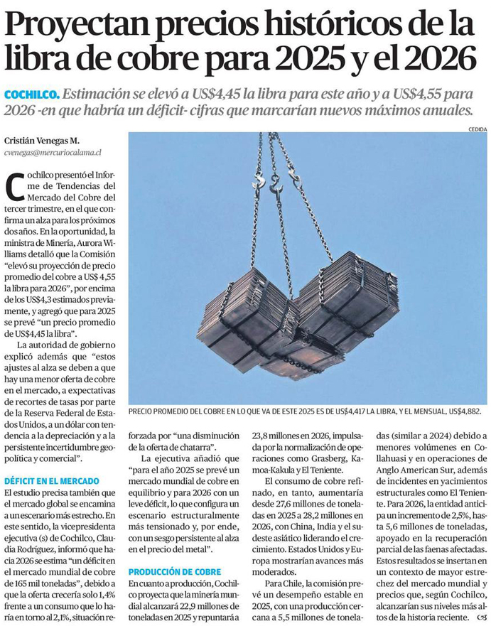 Cobre anotará precio promedio histórico en 2025 mientras Chile cerrará el año con nulo crecimiento productivo - (Diario Financiero)