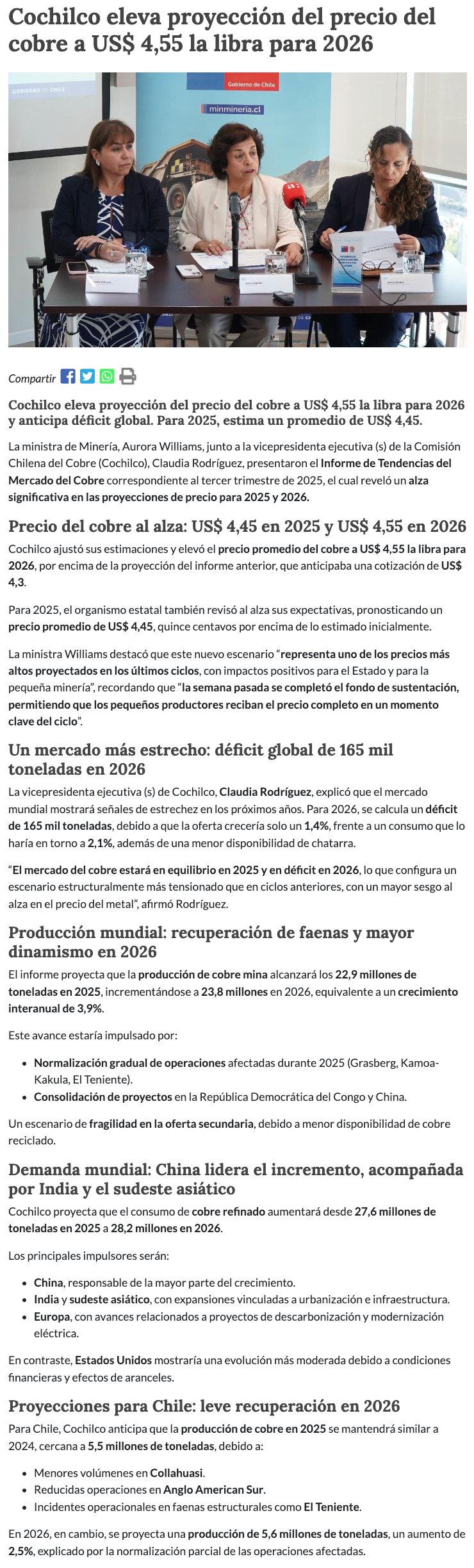 Cochilco proyecta mayor precio del cobre y leve alza en la producción chilena para 2026 - (Pulso)