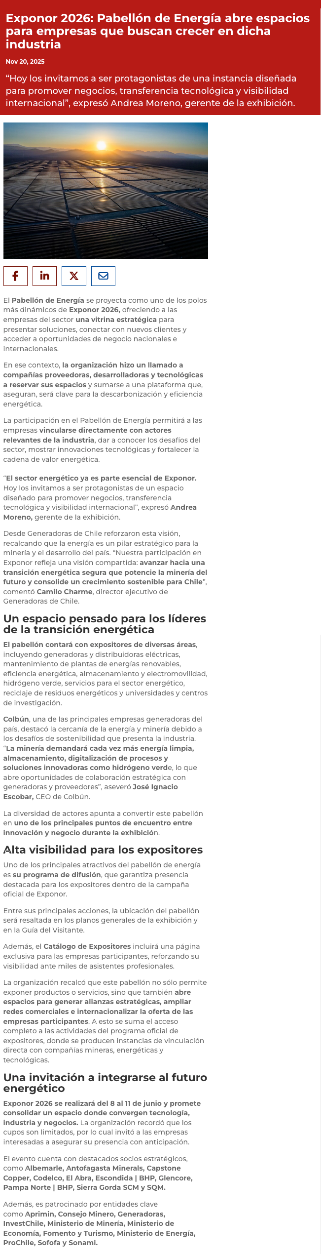 Pabellón de Energía de EXPONOR 2026 abre espacios para empresas que buscan crecer en la industria energética - (madero.cl)