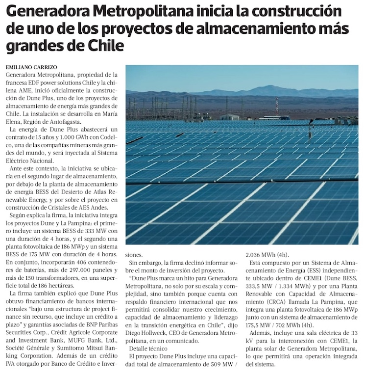 Proyecto de almacenamiento de energía a gran escala Dune Plus inicia su construcción - (El Mercurio de Antofagasta)